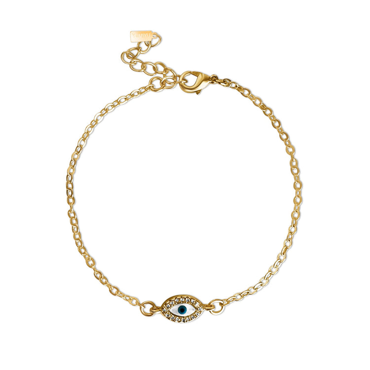 Our Dainty Evil Eye Bracelet evokes the wisdom and spiritual significance of the clover combined with a classic cuban link chain, artistically crafted in a durable, bright shine. A lobster clasp keeps this layering bracelet secure, finished with an extension chain for various wrist sizes.