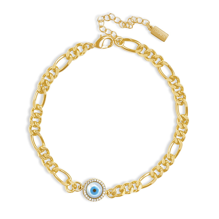 Our Blue Evil Eye Anklet features a classic Figaro chain in a rich shine, created with durable plating and strong links for frequent wear. A sparkling halo of stones frames the round evil eye, adding a luxe look to this mysterious talisman meant to bring luck and ward off bad energy.