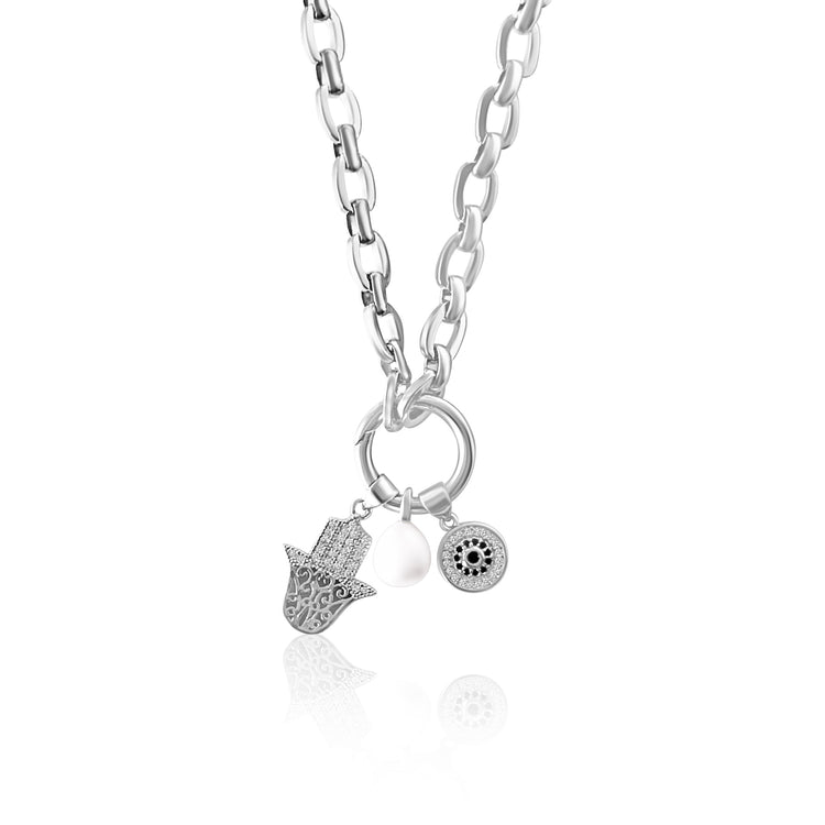 Embrace good fortune and ward off negativity with our Blessing Hamsa & Evil Eye Necklace. Made with gold-filled material and adorned with a pearl, this necklace not only adds a touch of elegance to any outfit, but also serves as a powerful symbol for protection and blessings.