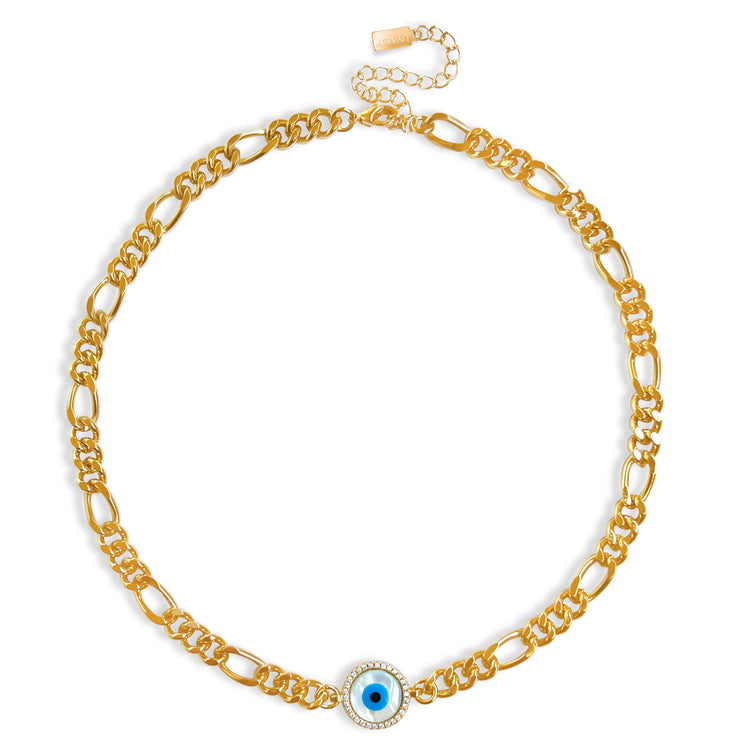 Our Personal Power Evil Eye Choker Necklace complements the Blue Evil Eye Bracelet, creating the perfect combination of modern trends and ancient cultural heritage. Ward off bad energies and enhance good luck and fortune with the evil eye! Add another layer of mysterious enchantment with the evil eye charm paired with a Figaro link chain, as this necklace sits choker length.