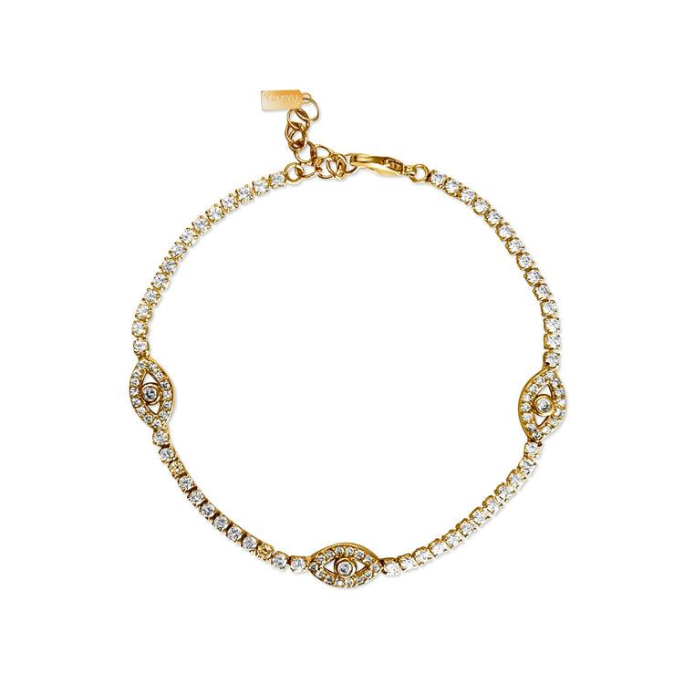 Our Diamond Evil Eye Bracelet evokes the wisdom and spiritual significance of the evil eye combined with a classic Figaro link chain, artistically crafted in a durable, bright shine. A lobster clasp keeps this layering bracelet secure, finished with an extension chain for various wrist sizes.