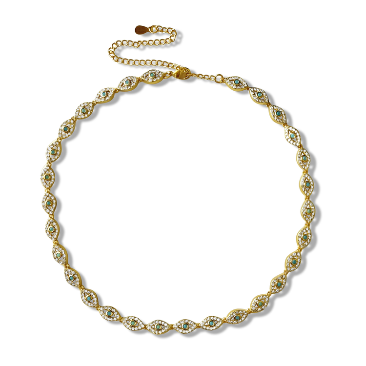This elegant necklace features a gemstone evil eye and diamond pendant, crafted with gold-filled materials. The eye is believed to bring protection and ward off negative energy, making it both a beautiful accessory and a meaningful talisman. Perfect for daily wear or special occasions.