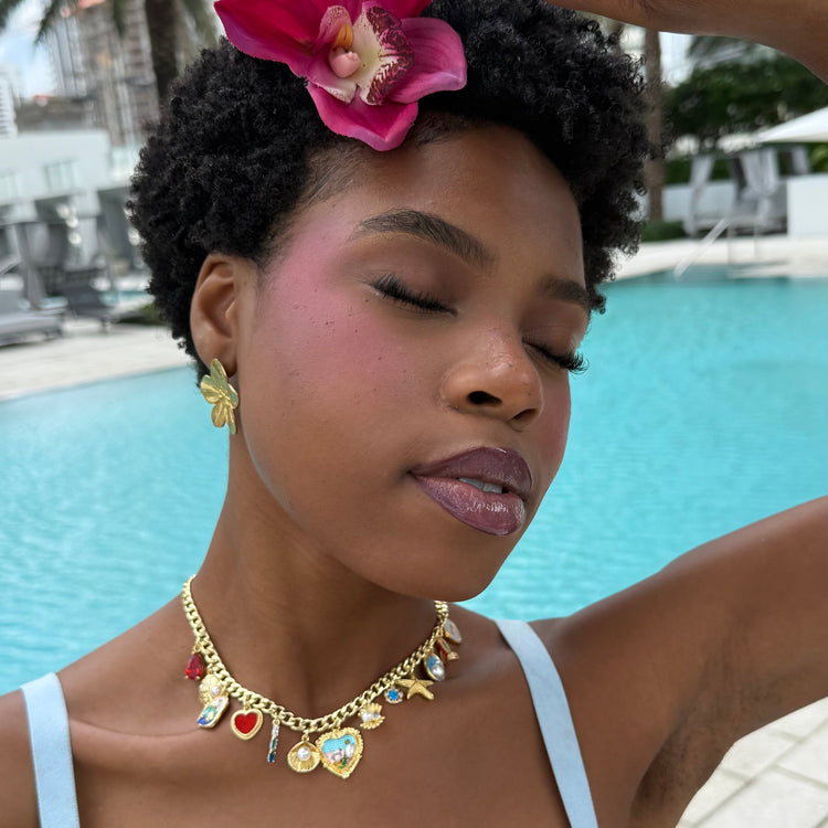 This stunning Joanna charm necklace boasts a unique and colorful design that is sure to make a statement. Each charm holds special meaning, making it a one-of-a-kind piece. Elevate your ensemble with this beautiful and meaningful necklace. With 13 stunning charms!