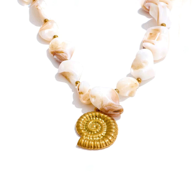 This gold filled summer necklace showcases the beauty of natural stone. With its unique design and lightweight feel, it adds a touch of elegance to any summer outfit. The natural shell also provides a gentle energy and promotes harmony and balance. Perfect for any style-conscious individual.