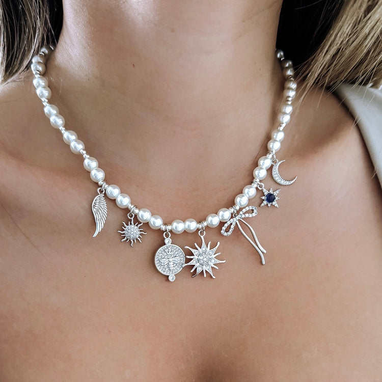 Expertly crafted and one of a kind, this silver charm pearl necklace is a stunning addition to any jewelry collection. With intricate sun, moon, and star charms, this necklace captures the beauty of the night sky. A perfect gift for any occasion.