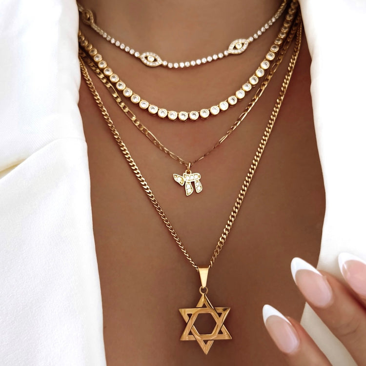 This elegant Chai & Star of David set in gold fulled includes four unique necklaces, featuring an evil eye choker and our popular tennis chain. Perfect for adding a touch of spirituality and style to any outfit.