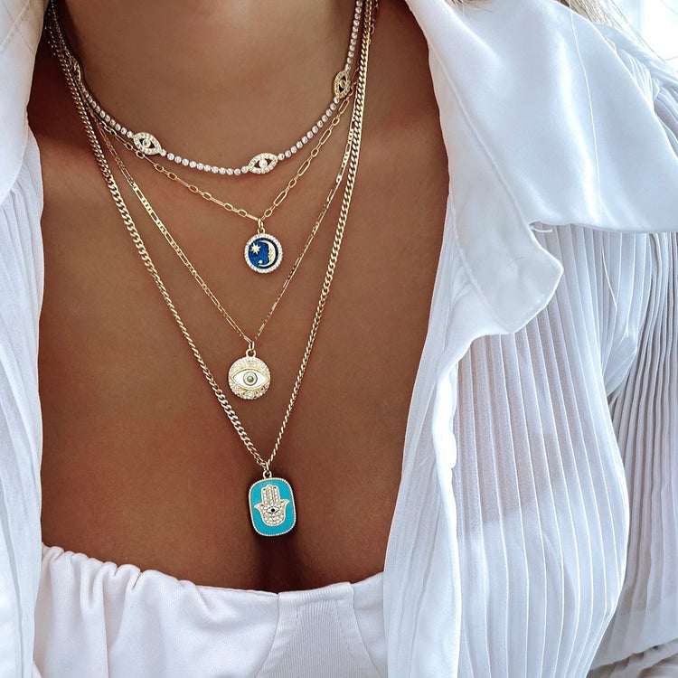 Enhance your style with our Double Sided Hamsa Hand Set. This set includes 4 necklaces featuring an intricate double sided hamsa hand design. Made with quality materials, these necklaces add a touch of mysticism and protection to any outfit. Elevate your look with this unique set.