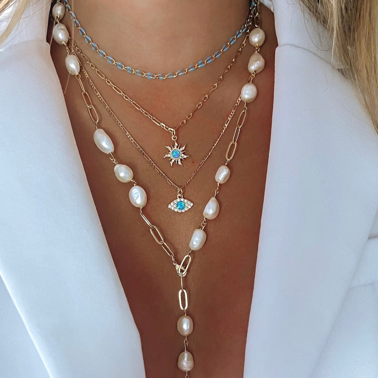 Upgrade your summer style with this stunning blue evil eye and sun set necklace. Accompanied by a mother of pearl chain, this accessory brings protection and charm to any outfit. Made with quality materials for long-lasting wear. Elevate your look with this unique piece.