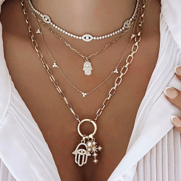 Enhance your spiritual journey with our Faithful Hamsa Hand Set. Featuring a beautiful pearl cross and Hamsa hand, this set serves as a symbol of protection and faith. Handcrafted with careful attention to detail, each piece carries a timeless beauty that reflects your devotion.